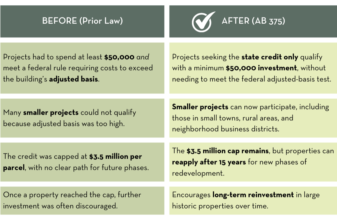 Expands eligibility for small projects: Removes a federal adjusted basis requirement for projects seeking only the state credit, while maintaining the $50,000 minimum. This change opens the door for smaller-scale rehabs in rural and urban communities.